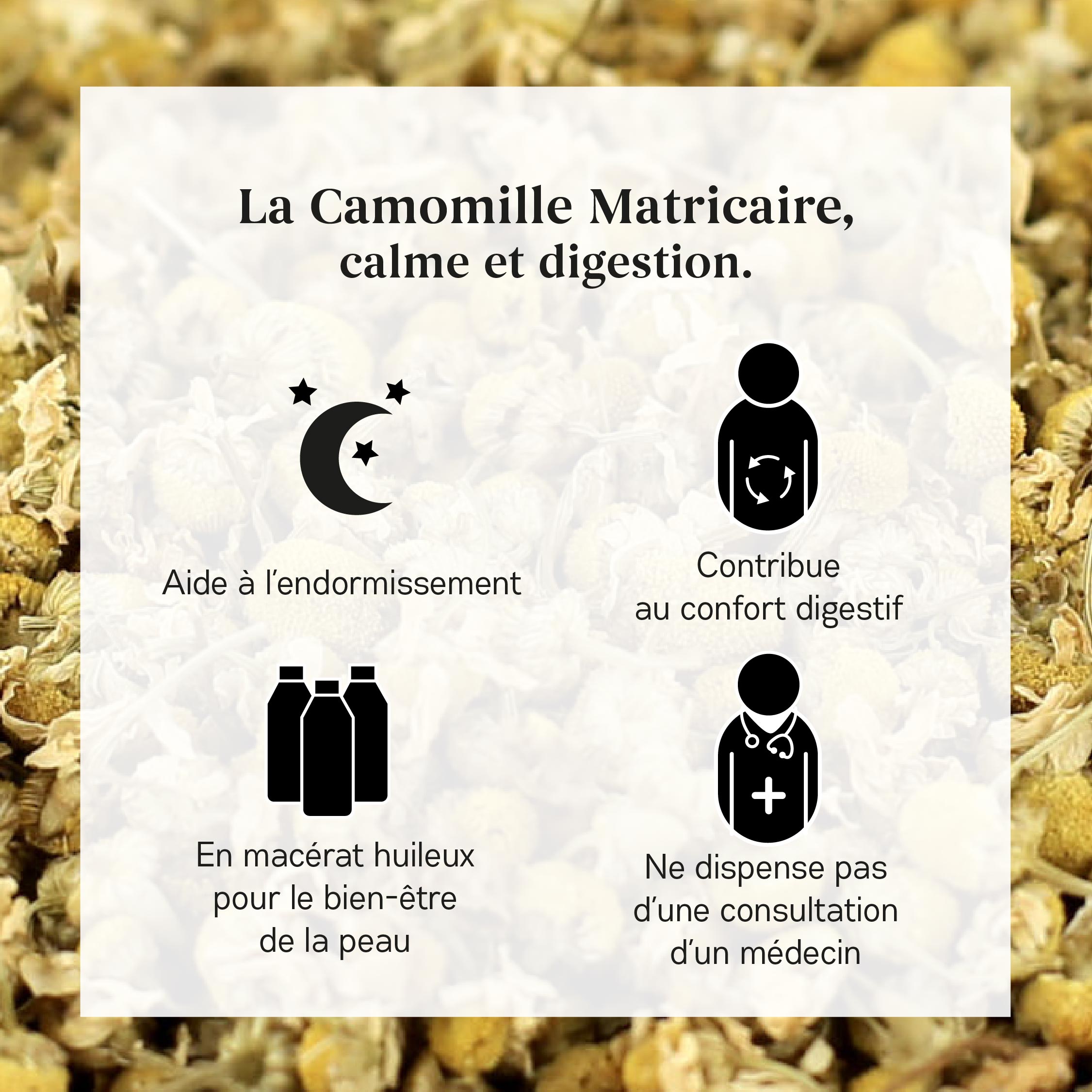 La camomille est reconnue pour ses multiples bienfaits. Elle apaise les maux digestifs, calme les petites inflammations cutanées. Mais son bienfait le plus célèbre demeure son effet apaisant, favorisant un sommeil profond et réparateur.