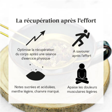Contrairement à de nombreuses infusions au CBD disponibles sur le marché, souvent composées de plantes de qualité moyenne masquées par des arômes artificiels, nous avons fait le choix de l'authenticité. Notre infusion au CBD Recovery est élaborée à partir de plantes issues de l'agriculture biologique, sélectionnées rigoureusement selon des critères stricts : aspect, goût, date de récolte, origine et teneur en principes actifs. Cette exigence garantit une infusion de haute qualité, respectueuse de votre bien-être.Un rituel revitalisant pour vos journées actives :