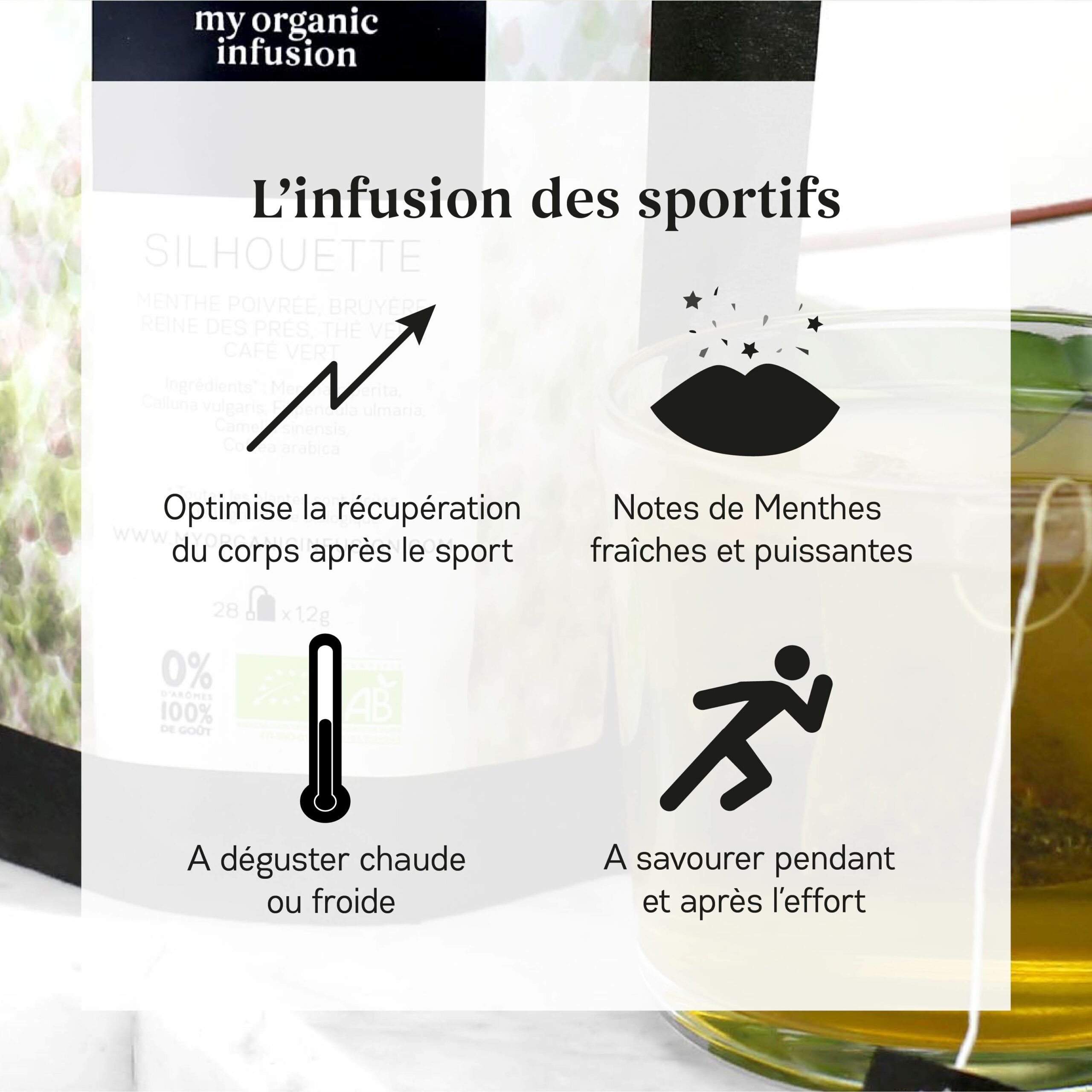 Chez nous, le bio est un pré-requis. Toutes nos plantes sont donc certifiées ECOCERT et Agriculture Biologique.Infusion SILHOUETTE bio 50 infusettes