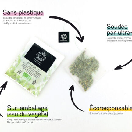 Notre conscience environnementale et notre exigence se retrouvent dans nos packaging. Nos infusettes sont sans plastique, composées de fibres végétales en amidon de cannes à sucres soudées par ultra sons, sans colle. Le sur-emballage est issu du végétale, conçu sans plastique, à base de bois d’Eucalyptus Européen. Bon pour le Home Compost.Mais pourquoi notre infusion Silhouette bio est sans arôme ajouté ?