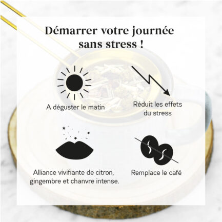 L’infusion au CBD Sunrise est conçue pour bien démarrer la journée. Grâce à une synergie de plantes telles que le maté, la citronnelle, le gingembre, le cynorhodon, l’écorce de citron et le chanvre CBD (30 %), cette infusion stimule naturellement l’énergie et la concentration tout en réduisant les effets du stress. Idéale le matin, elle constitue une alternative douce et équilibrée au café.Une composition unique et équilibrée :