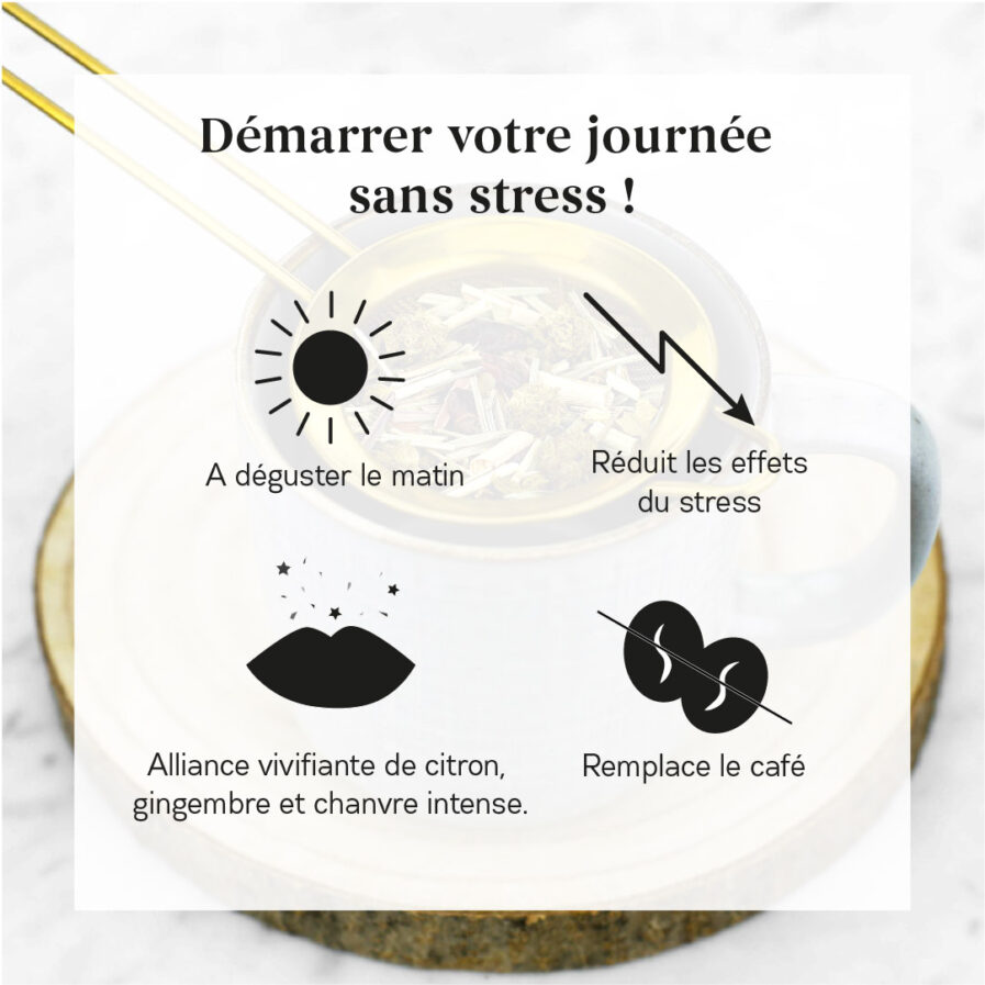 Contrairement à de nombreuses infusions au CBD disponibles sur le marché, souvent composées de plantes de qualité moyenne masquées par des arômes artificiels, nous avons fait le choix de l'authenticité. Notre infusion au CBD Sunrise est élaborée à partir de plantes issues de l'agriculture biologique, sélectionnées rigoureusement selon des critères stricts : aspect, goût, date de récolte, origine et teneur en principes actifs. Cette exigence garantit une infusion de haute qualité, respectueuse de votre bien-être.Un rituel revitalisant pour bien commencer la journée :