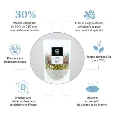 Il est recommandé de consommer 1 à 2 tasses par jour, le matin au réveil, de préférence en dehors des repas. Le CBD ne doit pas être fumé ; il est destiné à une consommation en infusion uniquement. Cette infusion est déconseillée aux mineurs, aux femmes enceintes ou allaitantes. En cas de traitement médicamenteux ou de pathologie chronique, consultez votre médecin avant utilisation. Si des effets indésirables tels que vertiges, palpitations ou troubles digestifs surviennent, cessez la consommation et consultez un professionnel de santé. Notez que les produits CBD peuvent contenir jusqu’à 0,3 % de THC, ce qui peut entraîner un résultat positif aux tests salivaires. Il est donc déconseillé de conduire ou de manipuler des machines après consommation régulière.Origine et engagement qualité :