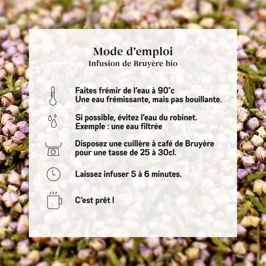 Faites frémir de l'eau à 90°c (une eau frémissante, mais pas bouillante). Si possible, évitez l'eau du robinet. Disposez une cuillère à café de "Bruyère bio" pour une tasse. Laissez infuser 5 à 6 minutes. C'est prêt !Notre métier et l'origine de nos plantes ?