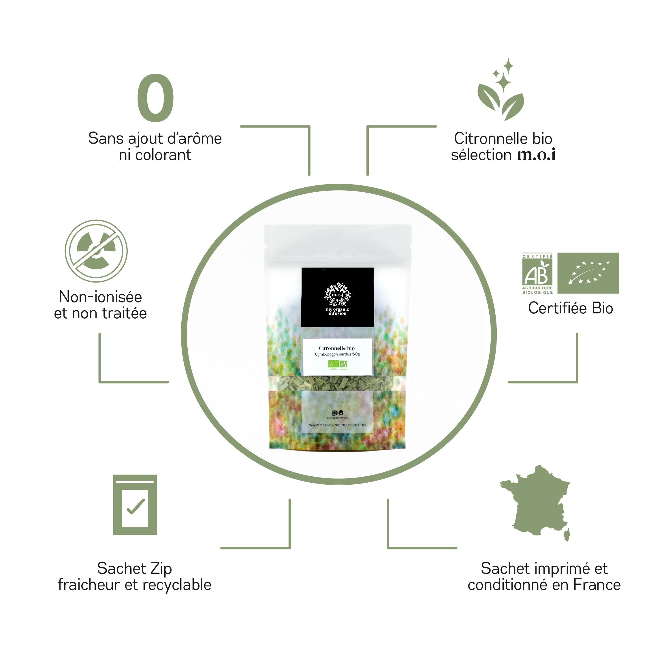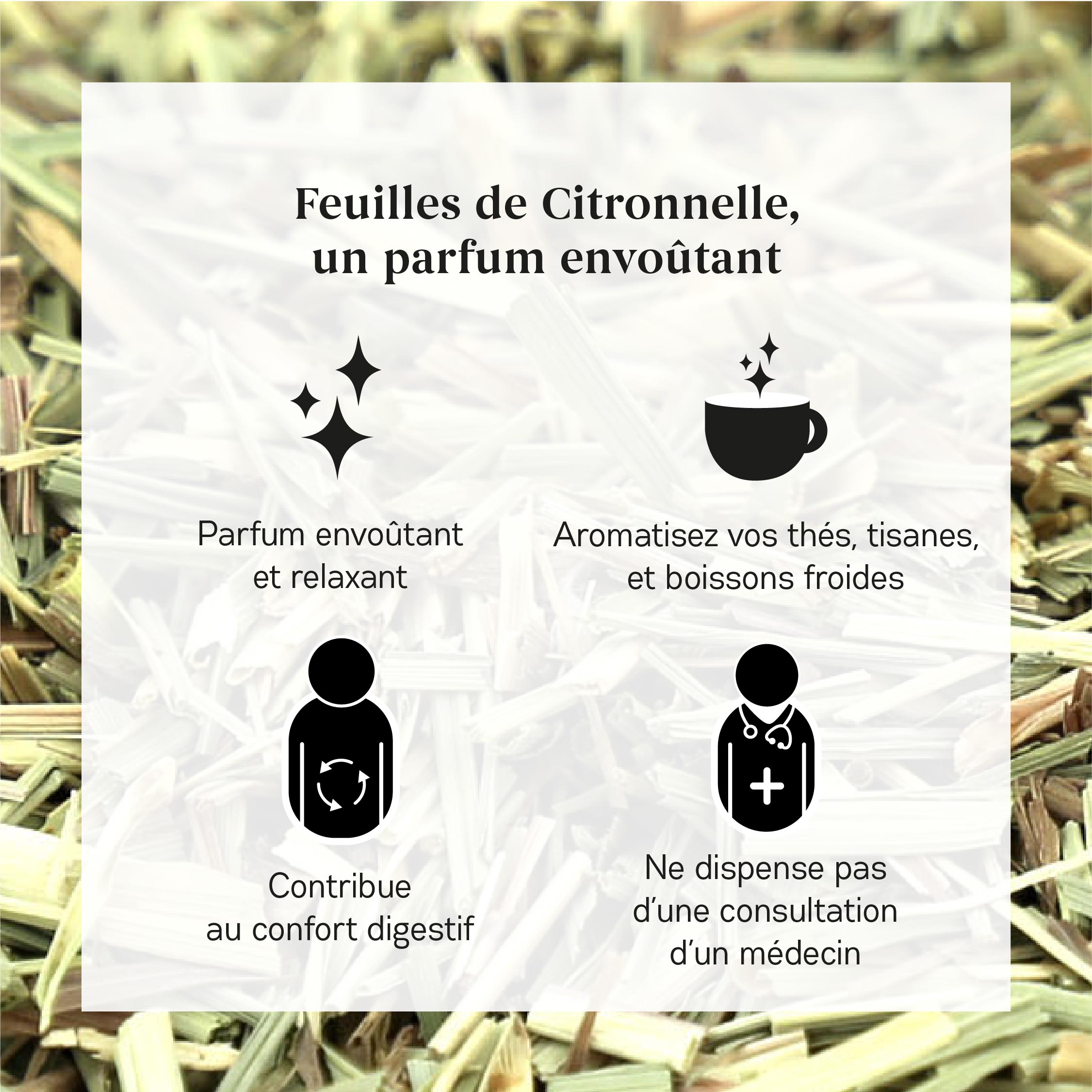 50 grammes de Citronnelle bio en feuille coupée pour créer votre infusion de Citronnelle bio.