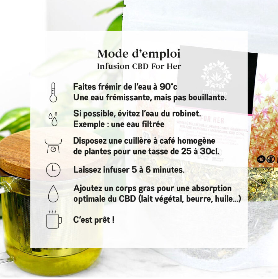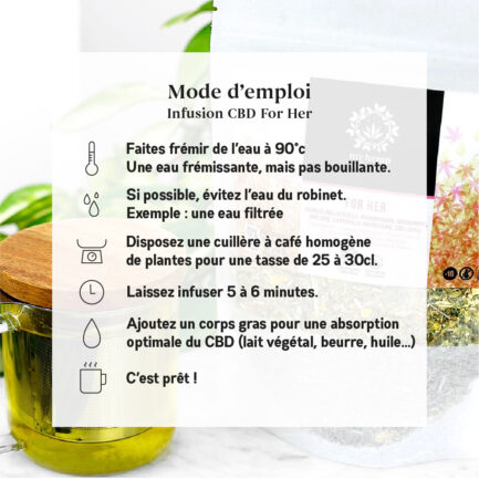 Mode d’emploi de l’infusion au CBD For Her : Pour préparer votre infusion au CBD For Her, portez de l’eau à frémissement (environ 90 °C). Ajoutez une cuillère à café du mélange dans une tasse de 25 à 30 cl. Laissez infuser pendant 5 à 6 minutes. Pour améliorer la solubilité du CBD, incorporez un corps gras comme une cuillère à soupe de lait de coco, de lait végétal ou un peu de lait entier. Cette étape optimise l’extraction des principes actifs.
