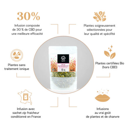 Bienfaits et vertus de l’infusion au CBD For Her : L’infusion au CBD For Her est spécialement conçue pour accompagner les femmes durant leur cycle menstruel. Grâce à une synergie de plantes telles que l'achillée millefeuille, les feuilles de framboisier, la camomille matricaire et le chanvre CBD (30 %), cette infusion aide à apaiser les crampes menstruelles et à favoriser un bon équilibre hormonal naturel. Elle constitue un allié précieux pour atténuer les inconforts liés aux règles douloureuses et soutenir la bonne régulation du cycle féminin.